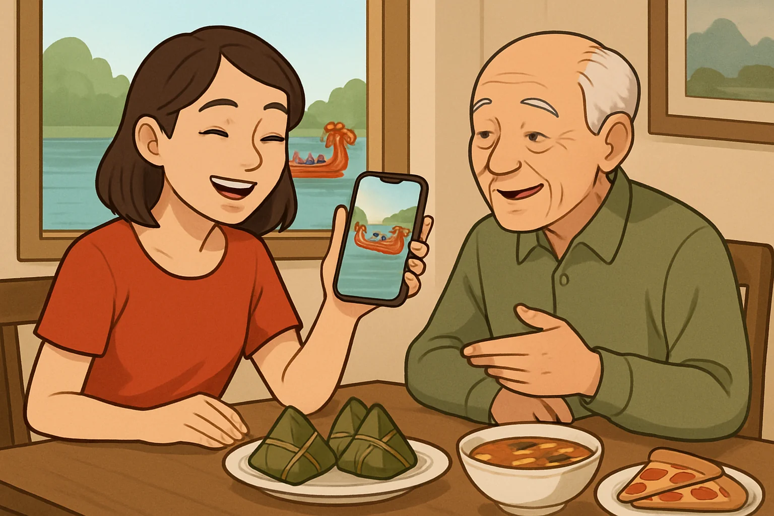 **文化细节:** 端午节(农历五月初五),中国人习惯吃粽子(糯米包在竹叶里),看龙舟比赛(人们划着装饰成龙形的船),纪念古代诗人屈原。